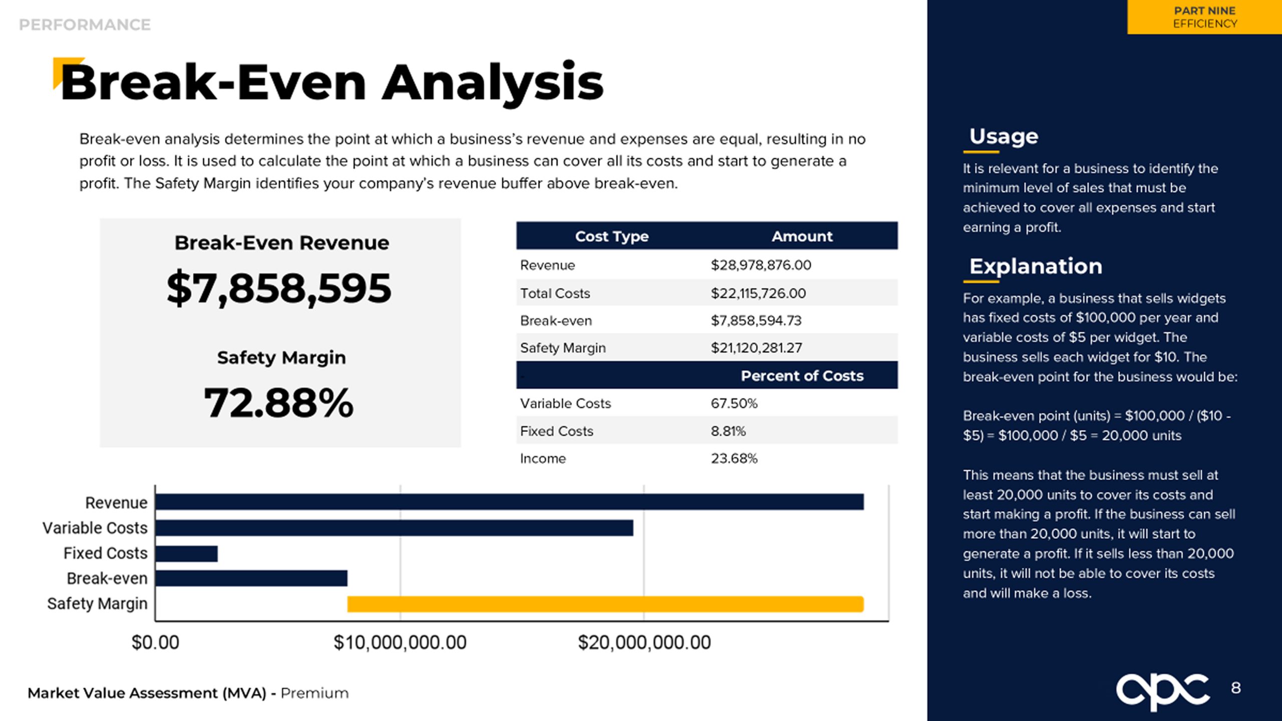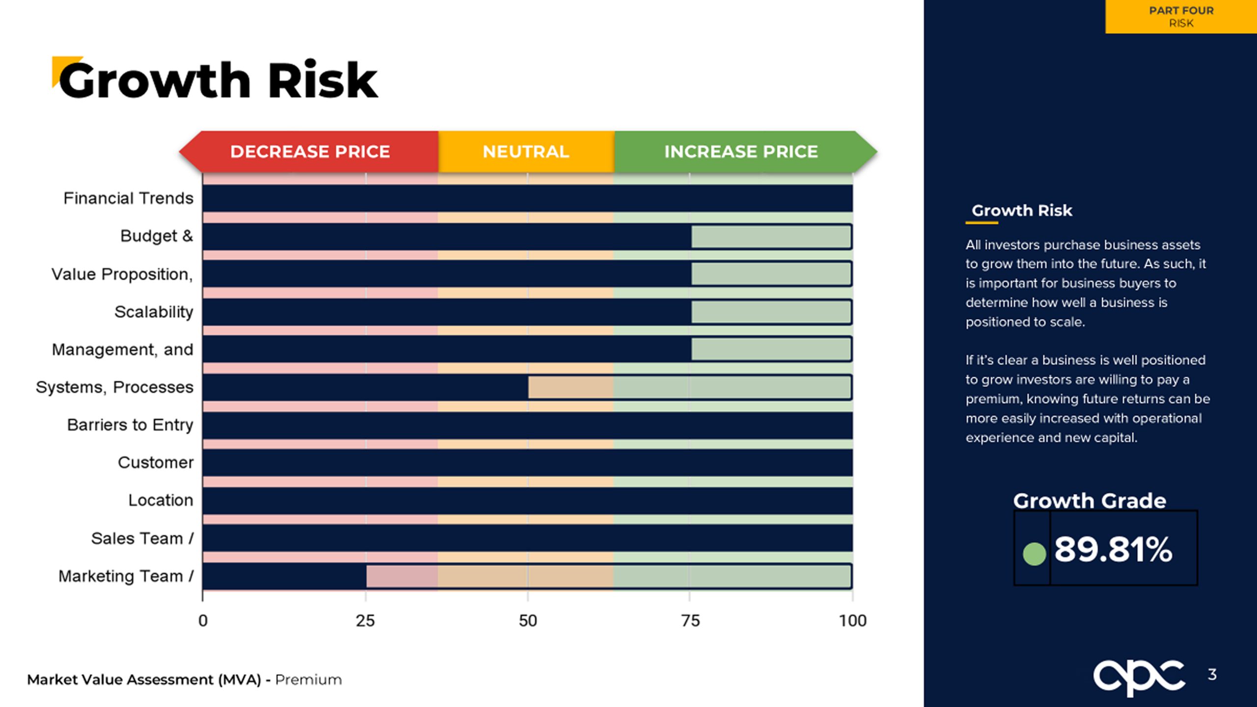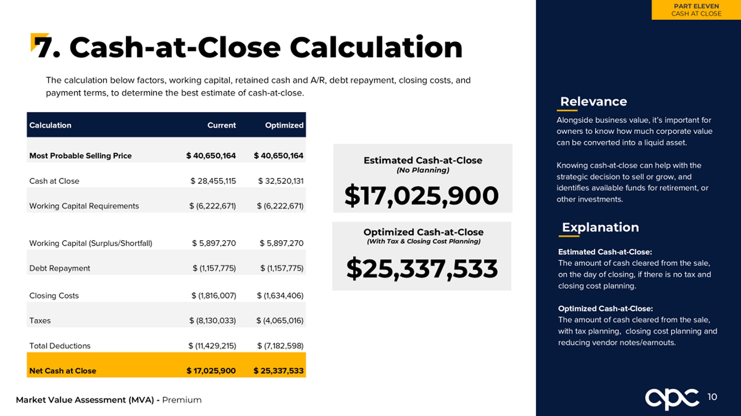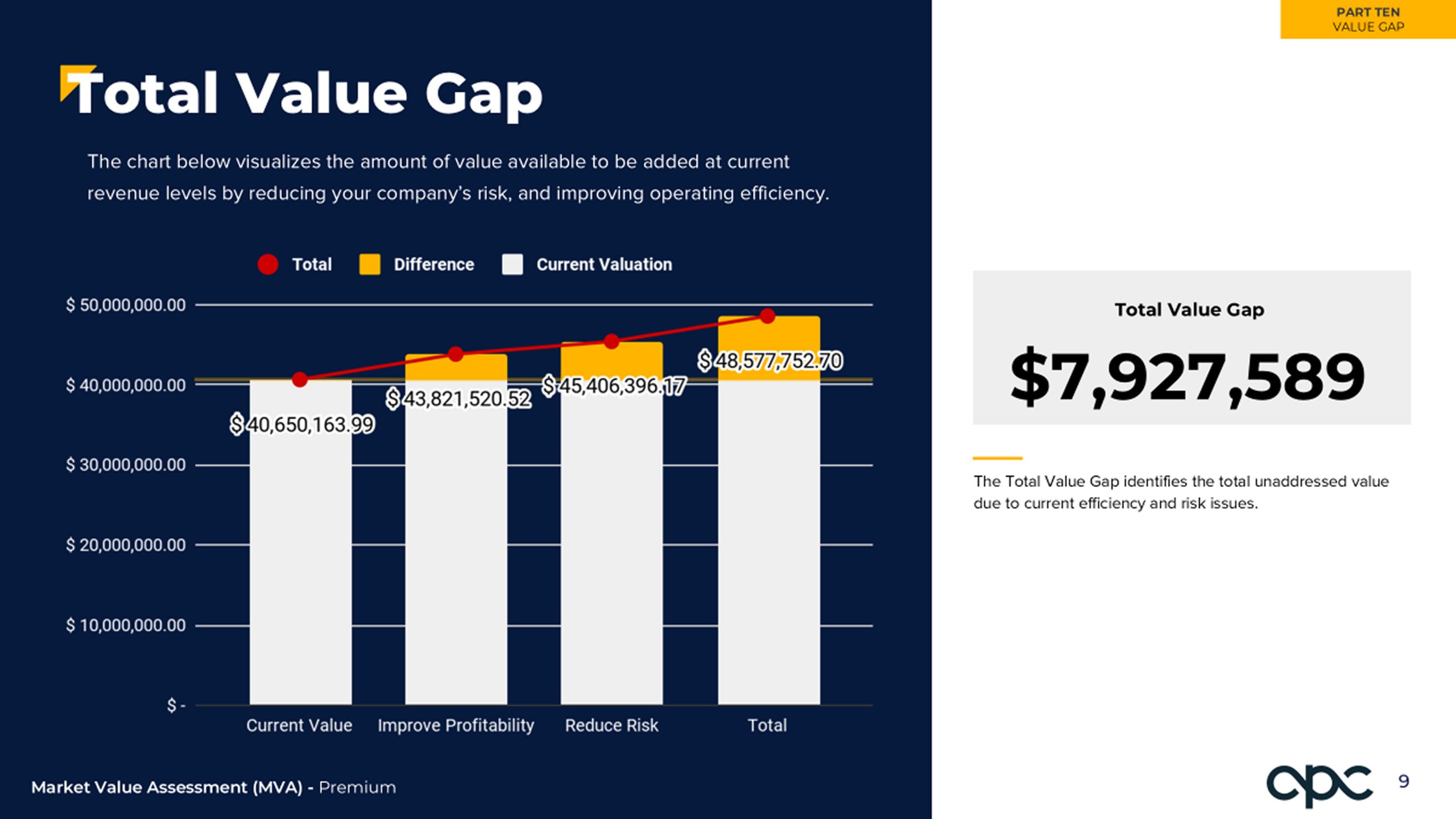 Using the findings in Part 9, this section shows the difference between your current valuation, your full potential, what’s on the table, and what’s being left behind.