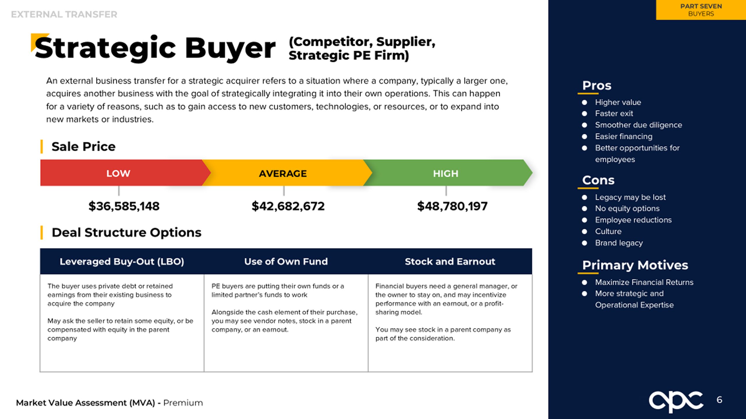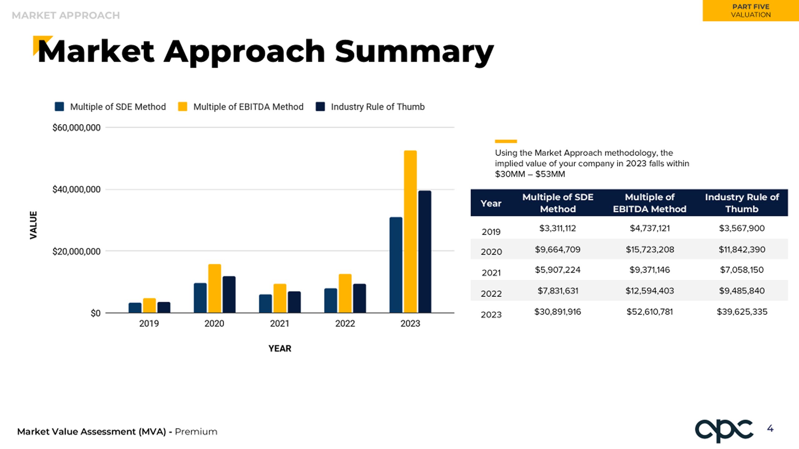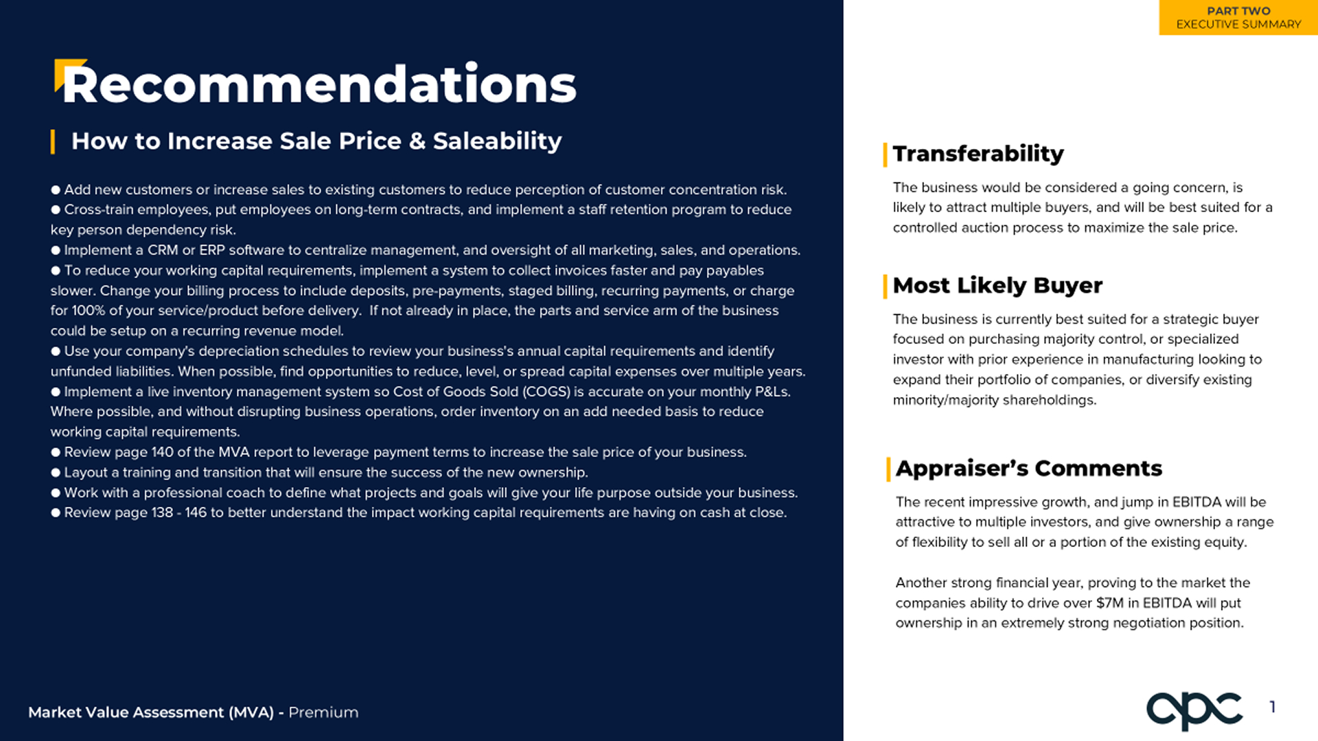 Key takeaways on market value, risk profile, industry multiples, and high-level recommendations.